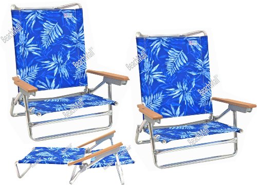 Set of 2 Chairs. This Beach Chair manufactured by Rio is made from quality materials to last you for seasons. You can recline to any of the 5 custom settings by easy lift of solid hardwood arms with exclusive safe adjust brackets and also fully reclines for all over tanning position. The arms are coated for weather resistance.