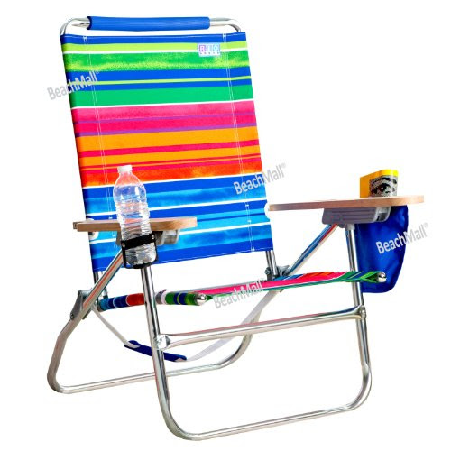 Classic High Back Beach Bum Chair with heavy duty anodized aluminum tubing can easily recline to any 4 positions of your desired comfort. Easy in & out seating from 12 inches off ground. Extra Wide Arms and cushioned head rest for added comfort. Two different carry options included: carry handle on wood arms or comfy shoulder strap.